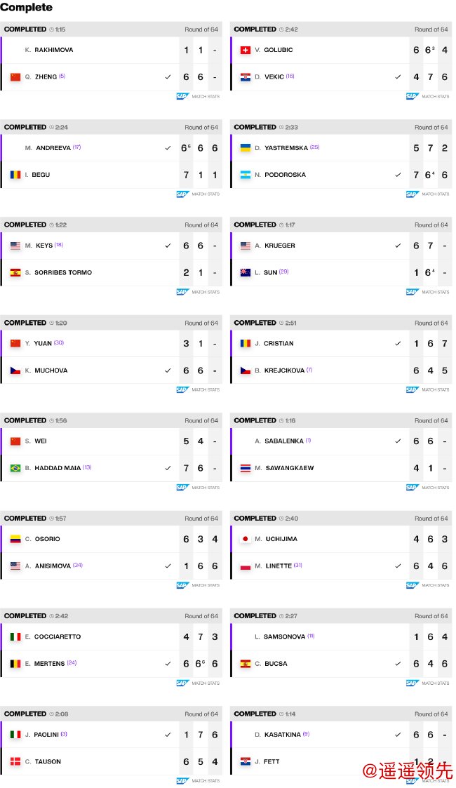 在莲花球场,18号种子凯斯一度打出连赢7局的攻击波,结果用时1小时22分钟,就直落两盘,以6-2/6-1横扫西班牙选手托莫,强势挺进32强。她将在下一轮对阵13号种子玛雅。