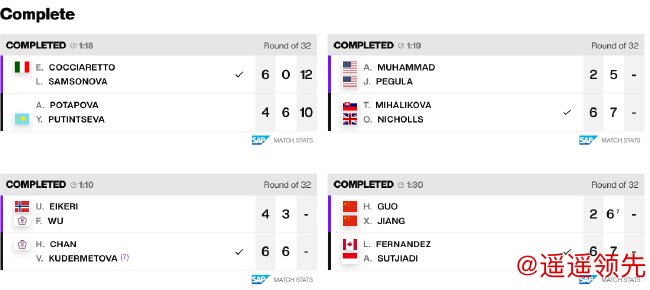 在3号球场,9号种子卡萨金娜仅用时1小时14分钟,就直落两盘,以6-1/6-2横扫幸运落败者、克罗地亚选手费特,顺利晋级32强。